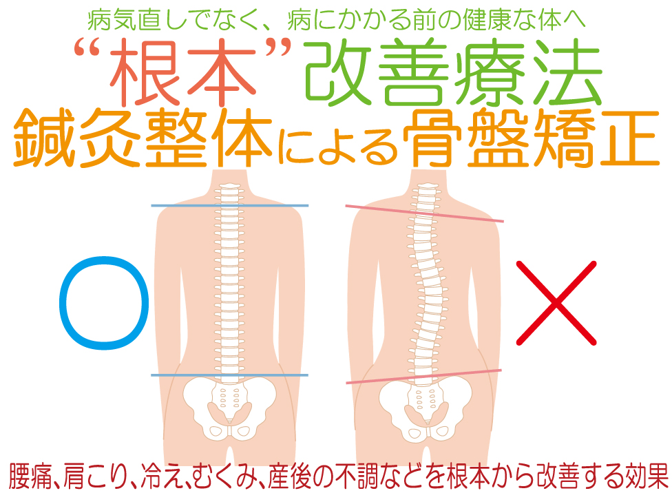 鍼灸整体による骨盤矯正は、手技や鍼を用いて骨盤・骨格の歪みを正しい位置に戻し、腰痛、肩こり、冷え、むくみ、産後の不調などを根本から改善する効果が期待できます。